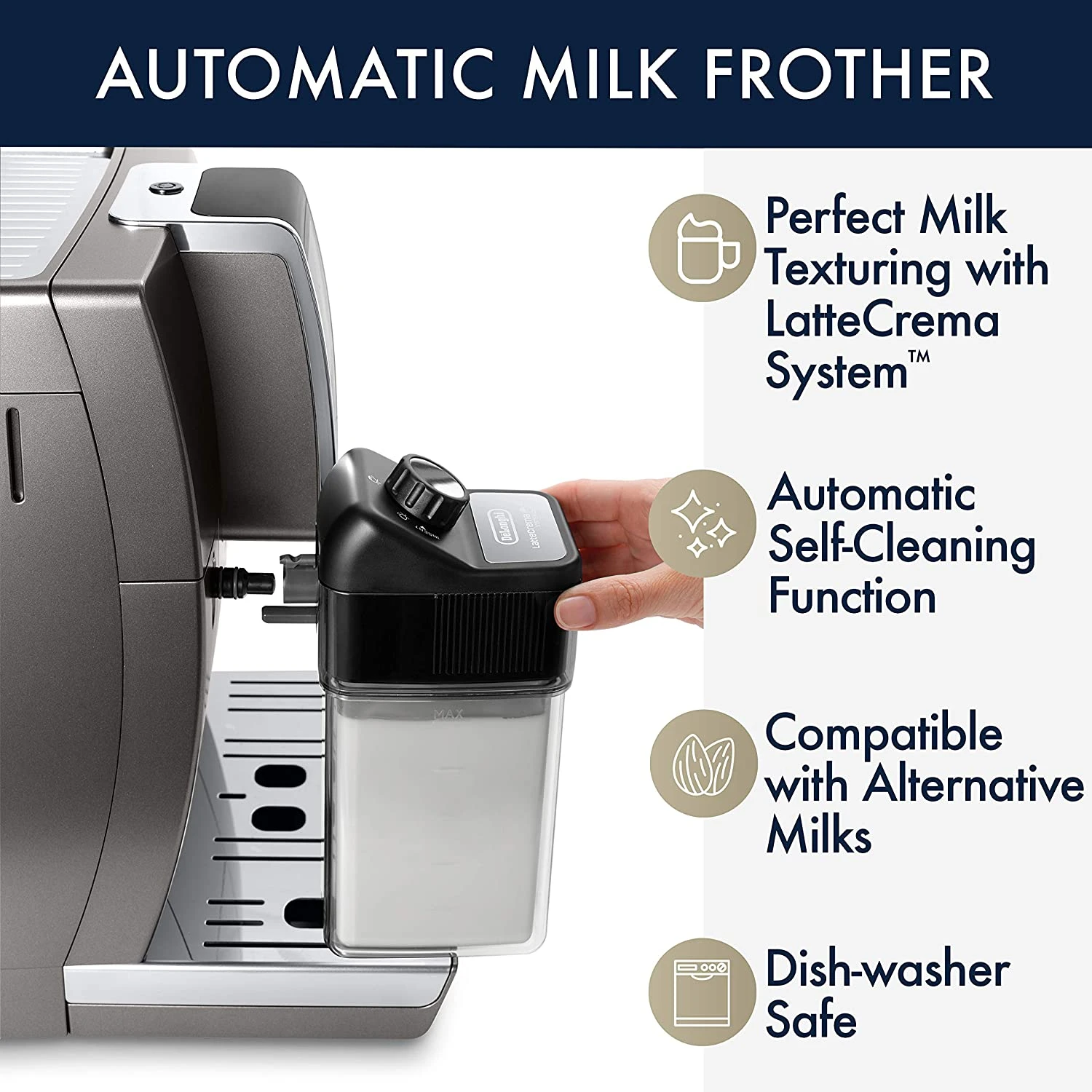Ergonomic thermal milk carafe with the proprietary LatteCrema System™ textures any milk of your choice and can be stored in the fridge to keep milk fresh when not in use.