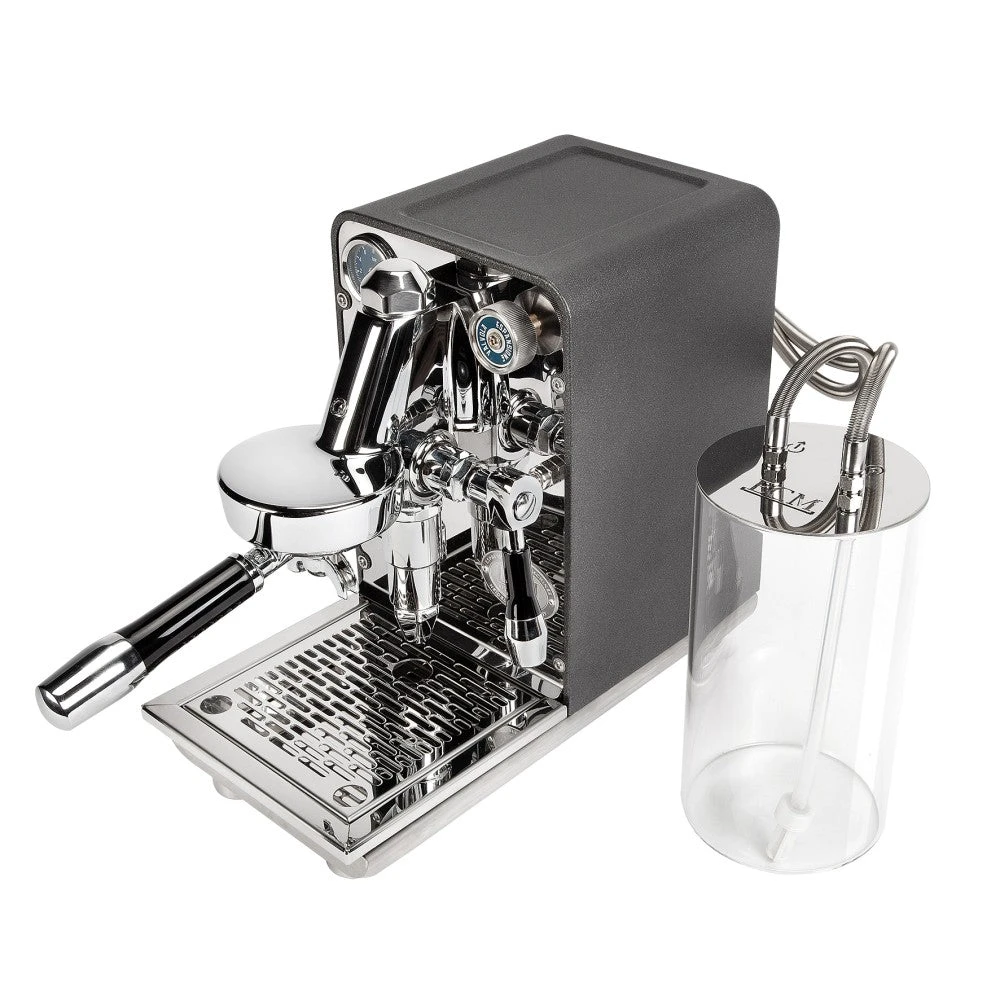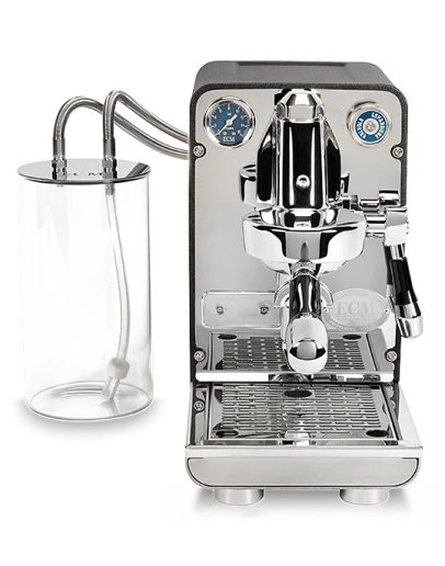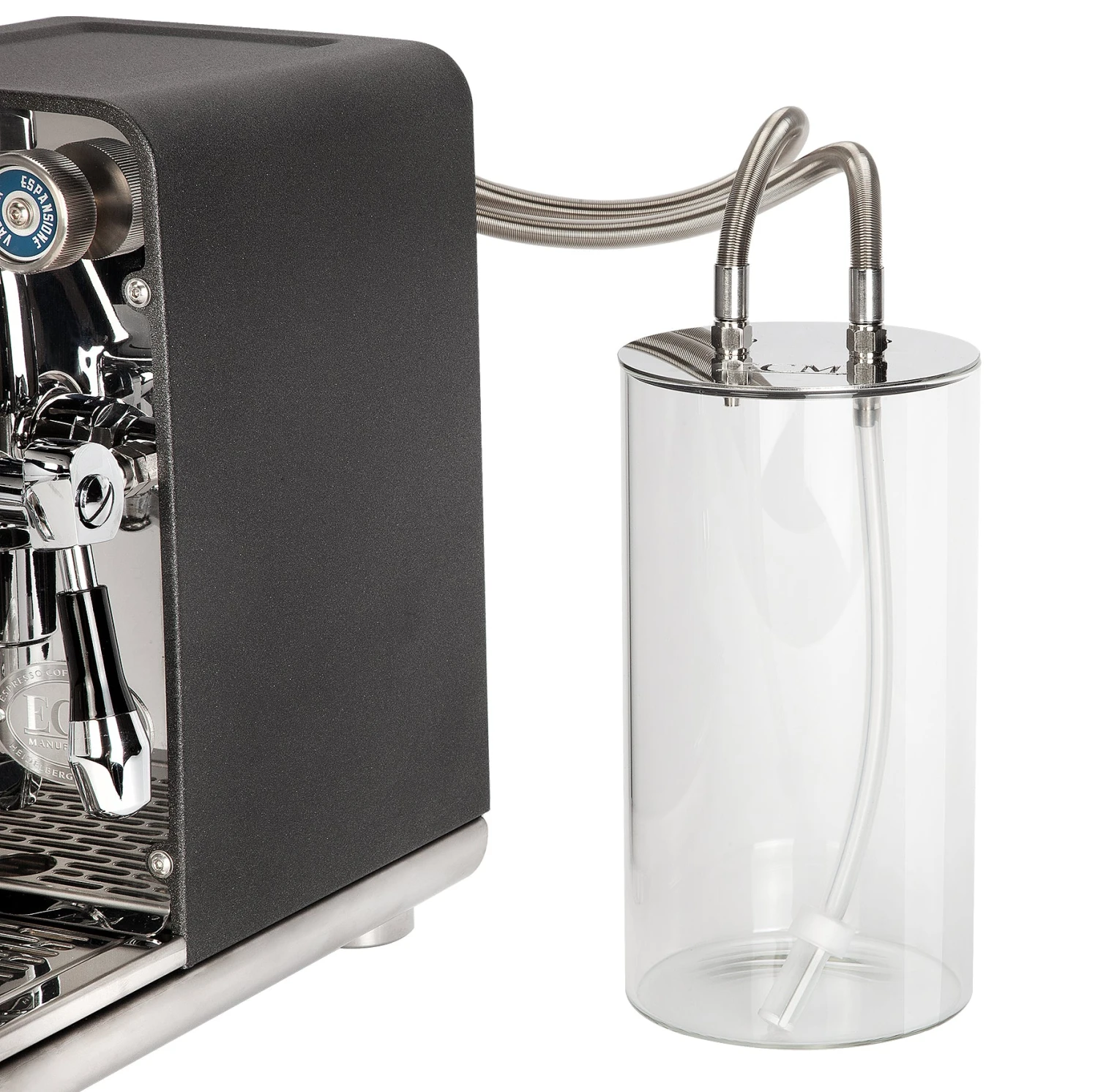 In an inspired bit of engineering, ECM separated the water tank from the rest of the machine. Connected via the braided steel water intake and return lines, the 2 liter glass reservoir can be positioned to your liking behind or on either side of the Puristika.