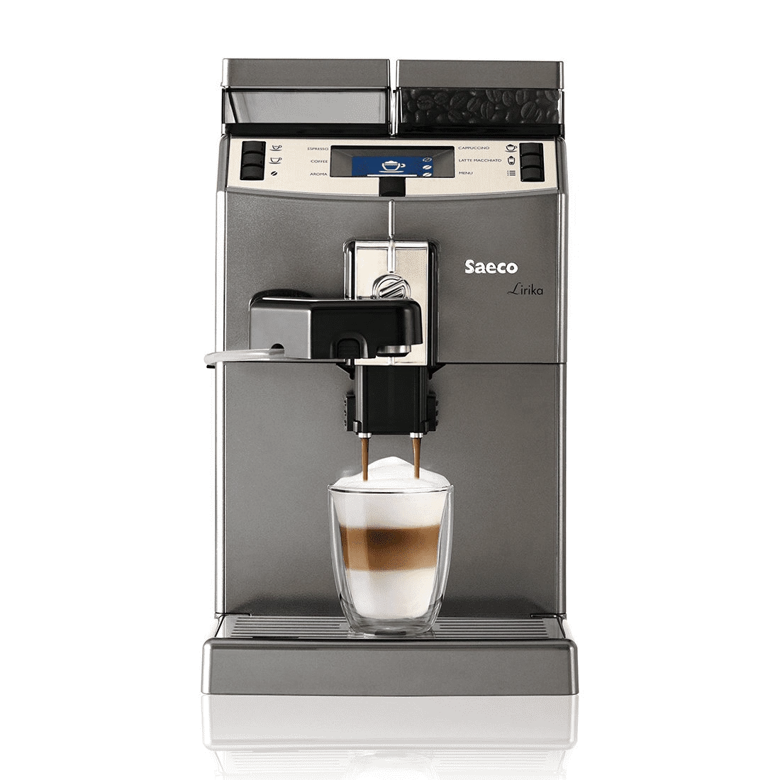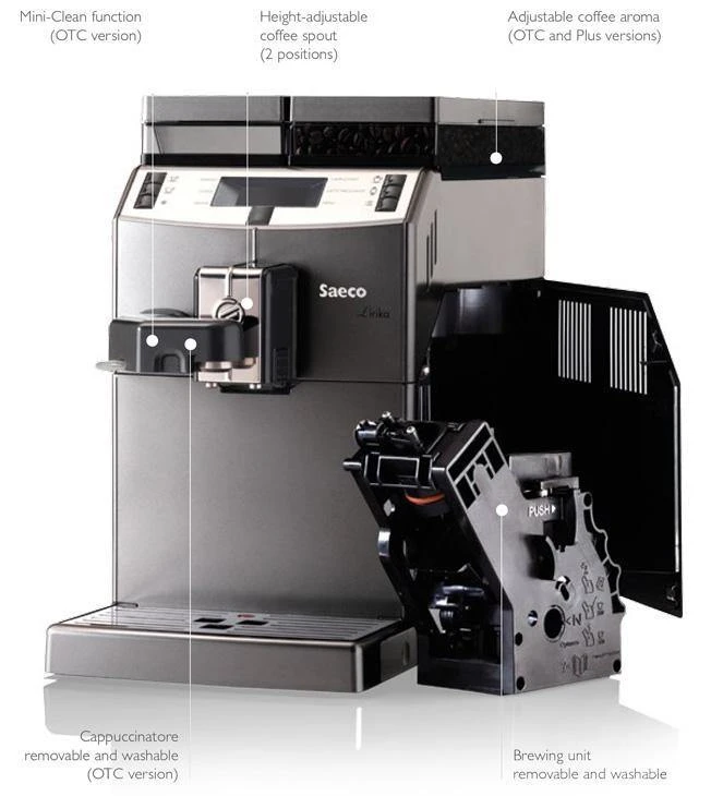 Fresh to North America after a successful introduction in Europe and Australia, the 120V Saeco Lirika One Touch Cappuccino (OTC) is here! All the comfort and smaller size of a home super automatic espresso machine, but built tough for light office duty, this machine serves perfectly either on the counter in your kitchen, or keeping employees caffeinated in the break room. Equally comfortable in small office and HoReCa settings, this Saeco Italian-designed machine provides a perfect cup of espresso, cappuccino, or latte macchiato.